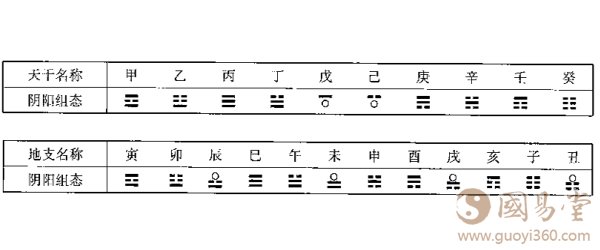 接下来,是考察八字的“阴阳气含”均平的问题。何建忠根据他自己拟想的“十天干、十二地支的创设源由”2,导出十天干、十二地支如下的阴阳构成符号:
