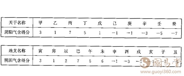 表中代表“阳”,代表“阴",O代表“太极”。接着,作者自创了一套“阴阳记分法”圆,列出天干和地支的“阴阳气含”得分如下: