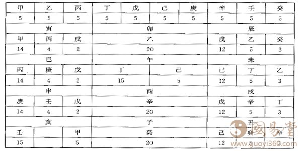 作者没有说明“公式求得之来龙去脉”,只是“直截了当的将次数组公式及其计算方法列出”。计算的出发点是以下“天干地支藏人元之本值”表: