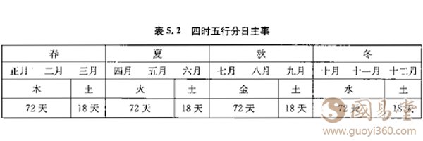 这里,“季”是指春、夏、秋、冬四季的最后十八日,即立春、立夏、立秋、立冬各节气前十八日,为季土当令之时。这跟前述《论四时休王》篇中的归纳有差异。《论四时休王》篇将六月(长夏)作为一个独立的季节单位,这足顺着汉代盛行的路子走(如中医《黄帝内经)》):春——夏——长夏(季夏)——秋——冬。然而,同在(五行大义》一书中,《论生死所》篇则指出:‘凡五行之王(旺),各七十二日。土居四季十八日,并七十二日,以明土有四方生死不同。”并且,它还明确指明五行每-行(包括土在内)在一年之中当“旺"(即作为当令之气)的具体时间,各为七十二日: